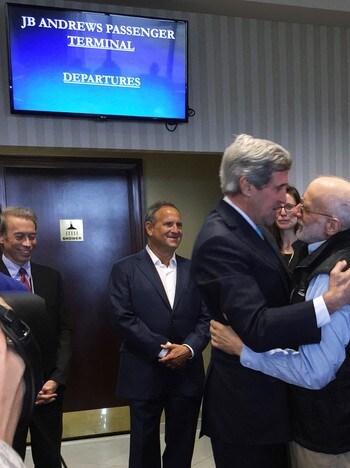 US Secretary John Kerry embraces American Alan Gross, who was released by Cuban authorities as part of a prisoner exchange agreement Wednesday. The agreement paved the way for a resumption of diplomatic relations between the US and Cuba.