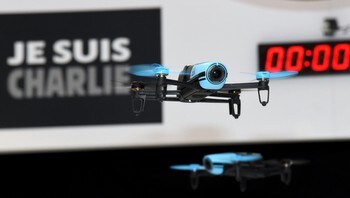 A drone from a French manufacturer of such vehicles on display in front of a Je suis Charlie poster in the period after the terrorist attacks. Photo: Ethan Miller / AFP