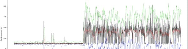 An example of variation of punctuality. The graph shows the trains’ punctuality at a station. The vertical axis shows the amount of time spent at the train station, and the points on the horizontal axis of each train. The graph covers the period during which one of the tracks on a double track line was closed for maintenance. Before the track is closed using all trains almost as much time at the station. But when the track closed, most people use the trains a lot longer.